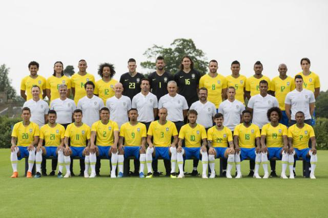 A Confederação Brasileira de Futebol divulgou hoje (08) a foto oficial da seleção brasileira, juntamente com a equipe técnica, para a copa do Mundo Rússia 2018. Sentados: Roberto Firmino, Taison, Philippe Coutinho, Thiago